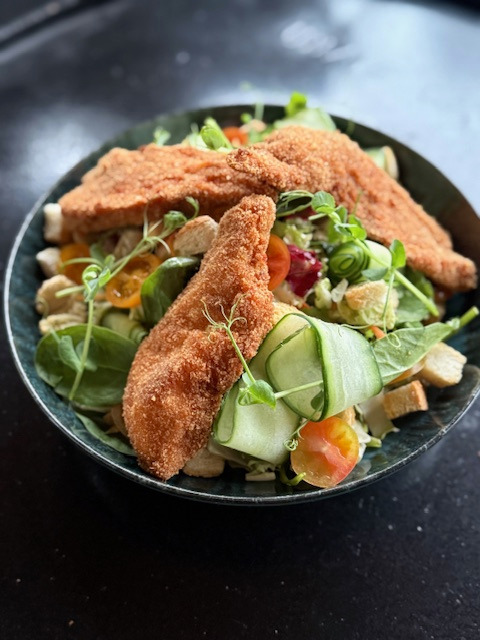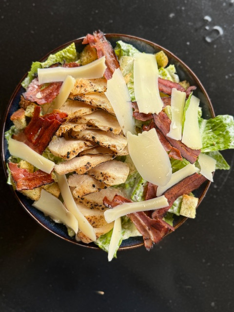 Caesar s grilovaným kuřecím prsem, slaninou, originálním dresingem z ančoviček, krutóny a sýrem Grana Padano
