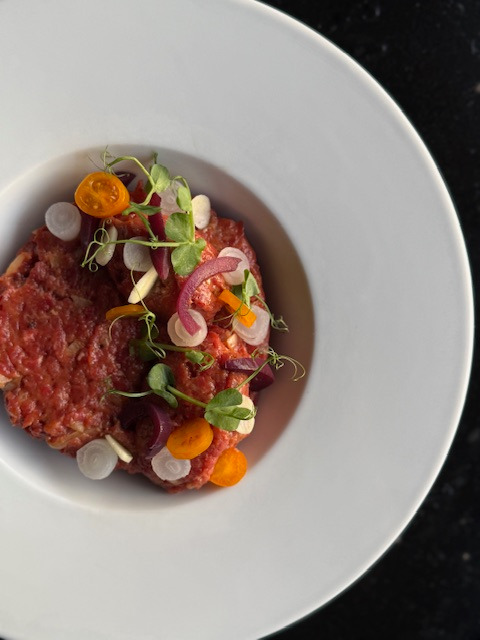 Medailonky z vepřové panenky na grilu, sázené vejce, červená cibule, opečené plátky brambor